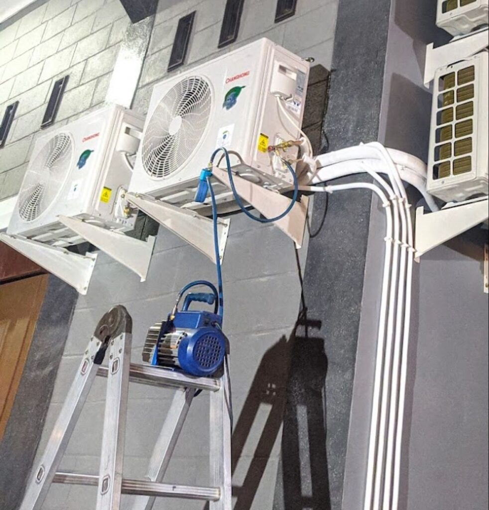 Pemasangan outdoor AC juga tidak bisa asal ,pertama kita harus pilih lokasi yang tepat ,sirkulasi udara yang baik terlindung dari sinar matahari langsung supaya kompresor outdoor tidak terjadi overheat amper tinggi , dan terakhit jangan sampai ketinggalan sebelum kita buka kunci L alirkan freon pastikan kita wajib Vakum instalasi maupun unit AC tersebut untuk menghlingkan udara dan uap air dari sistem agar ac tetep dingin dan jangka panjang .